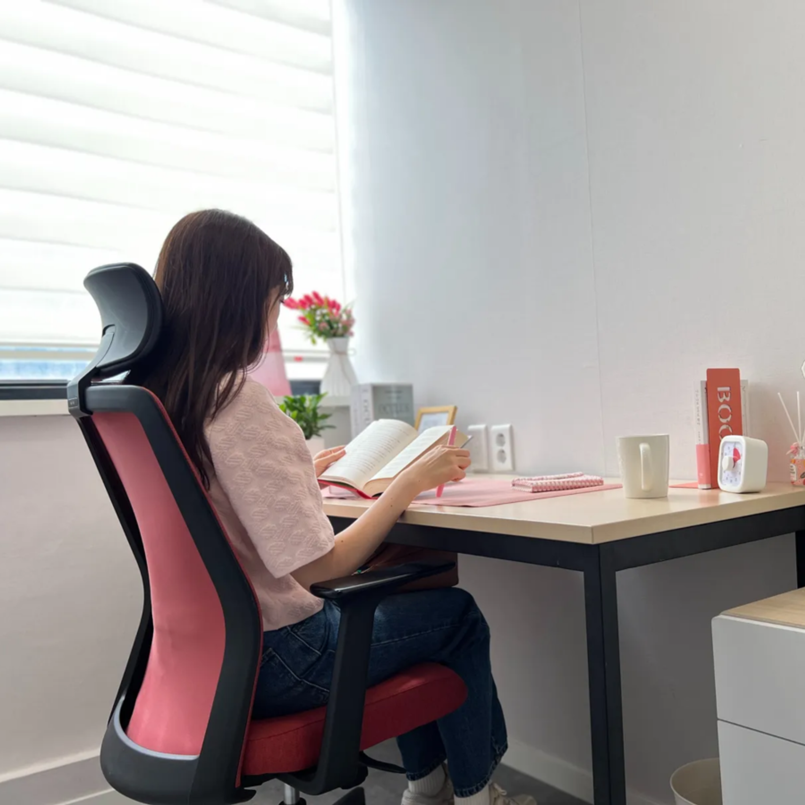 아침 햇살이 자연스럽게 들어오는 밝고 개방적인 1인 전용 공간입니다. 자연광 아래에서 더 높은 집중력을 경험할 수 있습니다.